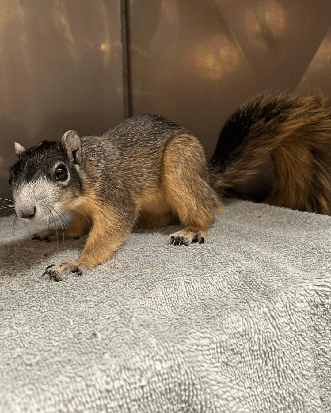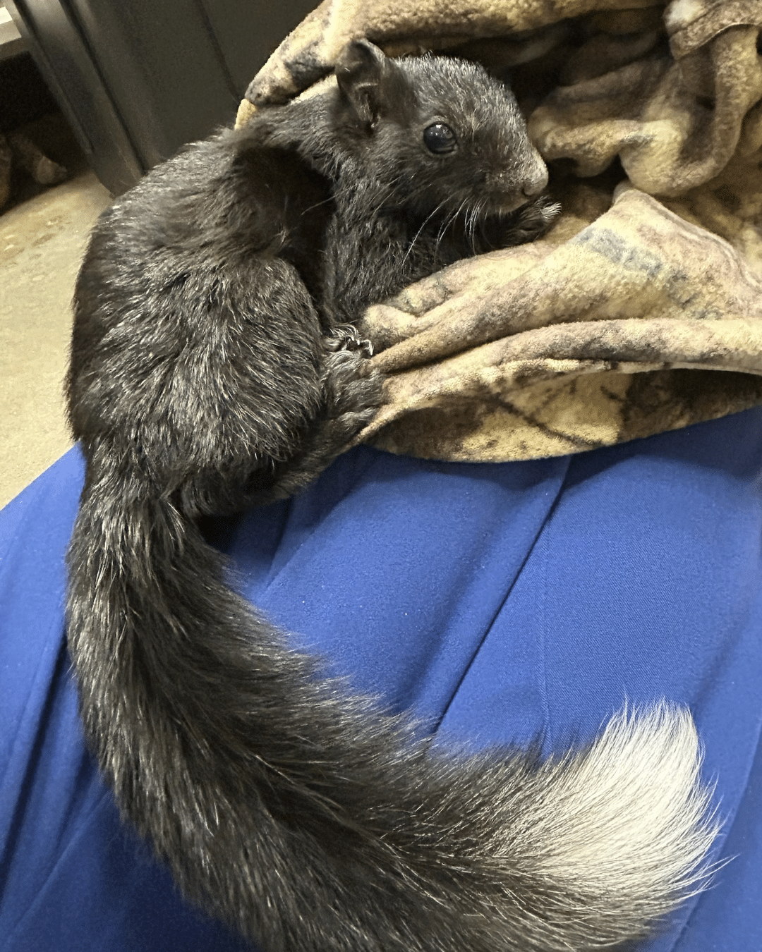 The other squirrel was admitted after falling from a nest. Both were treated for injuries related to high falls, including dehydration and pain, and one arrived with a nosebleed requiring close monitoring. Once stabilized, the squirrels were placed on specialized formulas and diets to support healthy development.