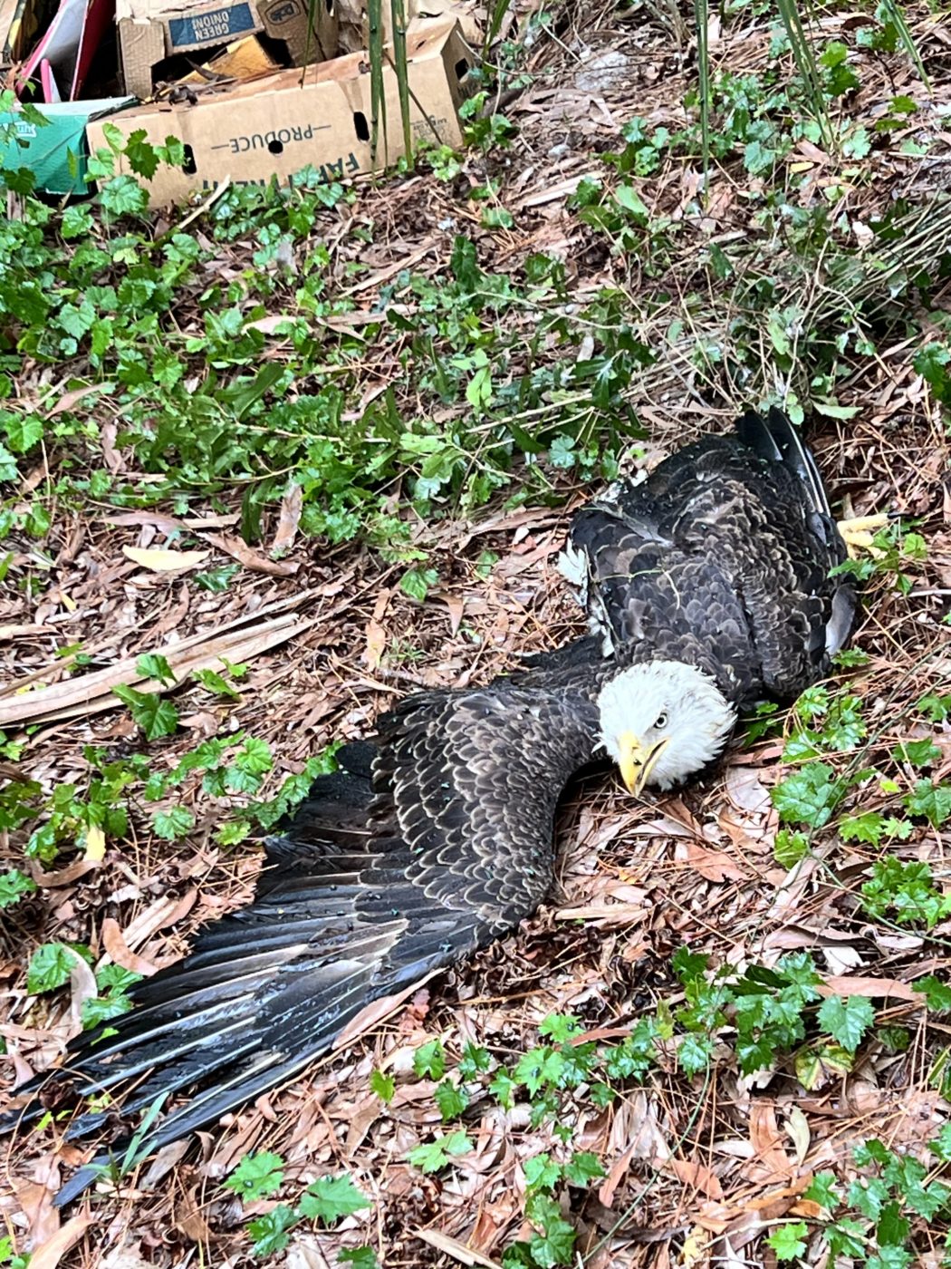 When we arrived at the location, the eagle was tangled in Muscadine vines and had flies all around him. We were able to successfully contain the eagle and free the bird from the vines.