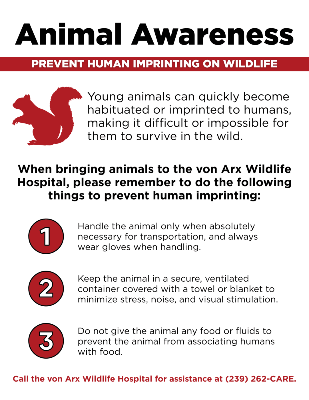Call 239-262-2273 for wildlife assistance. We are located at 1495 Smith Preserve Way in Naples, FL. Open every day from 8am to 6pm.
