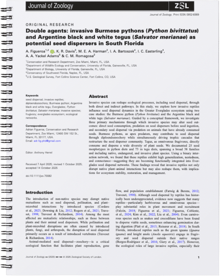 A newly published scientific study reveals that invasive Burmese pythons do more than threaten native wildlife in South Florida; they may also be altering how plants spread across the landscape. Biologists Ian Bartoszek and Ian Easterling on the Conservancy of Southwest Florida’s python team are pleased to have contributed field data to “Double agents: invasive Burmese pythons and Argentine black and white tegus as potential seed dispersers in South Florida,” published in the Journal of Zoology in 2025.
