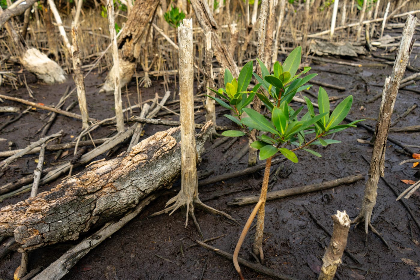 "In the early 1990s, this once beautiful black mangrove forest collapsed, leaving a landscape of dead trees. Even mosquitoes avoided this area since there was no life even to sustain them."